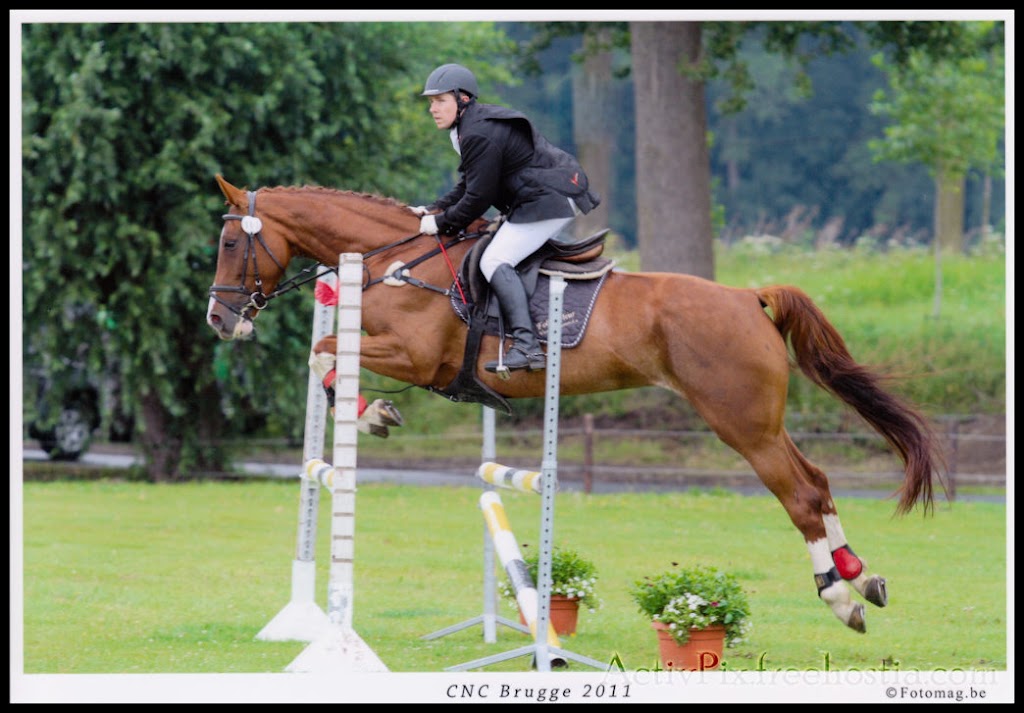 Na een kort wandeling, waarbij Folie mij duidelijk aangaf dat ze wat nerveus was, maar toch vol enthousiasme aan de cross wou beginnen, konden we aan de opwarming beginnen. Folie wist wat er zou volgen en was dus zeer voorwaarts en trok hierdoor zeer hard naar de spongen. Toen ze echter geconfronteerd werd met een witte boomstam die ze nog niet gesprongen had, blokkeerde ze plots en onverwacht, waardoor ik plots op de grond lag. Gelukkig zonder ernst dankzij de body-protector en de airbag. Ik kroop dus snel opnieuw in het zadel en reden de boomstam onmiddellijk weer aan. Folie begreep uit mijn benen dat er niets te vrezen viel van de stam en sprong hem dus vlot.